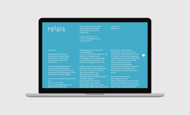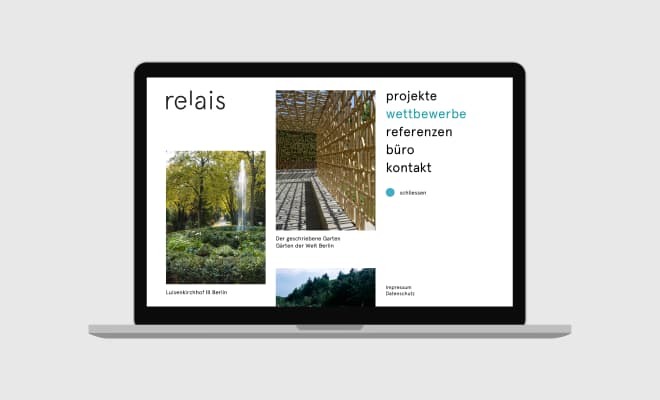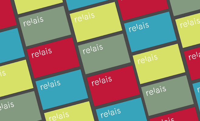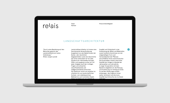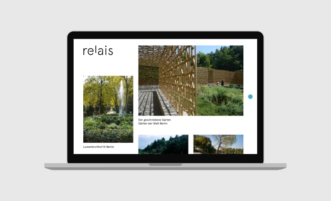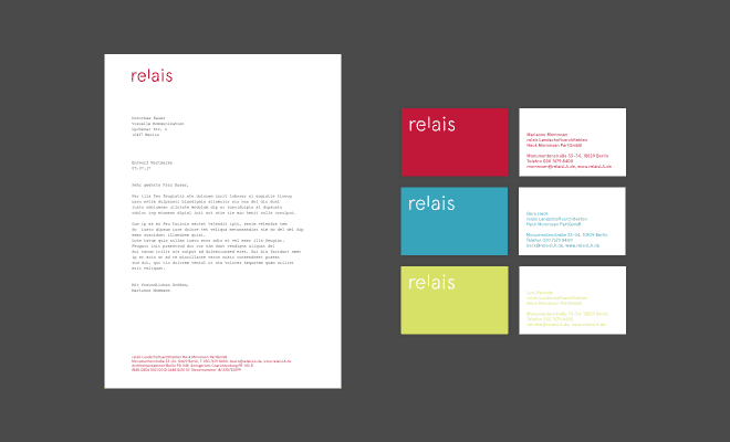 Die Natur befindet sich im ständigen Wandel. Auch die durch den Menschen gestaltete Landschaft bleibt nie gleich. Das Erscheinungsbild von relais spiegelt diese Veränderung der Natur, die durch fortwährendes Wachstum entsteht. Ein variabel einsetzbarer Farbklang ergänzt die konstruierte, aber unvollendete Form der Wortmarke.