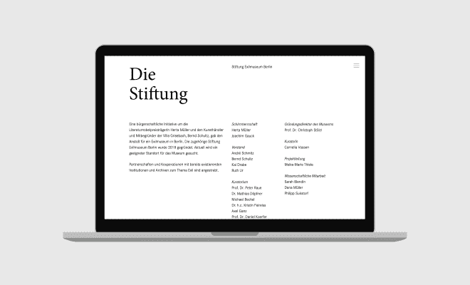 Die Website informiert über aktuelle Entwicklungen sowie über Vision und Hintergründe des Vorhabens. Mit Einblicken in erste Schenkungen, Pressestimmen und persönlichen Stellungnahmen wirbt die Stiftung für Partizipation und die Unterstützung der Idee.